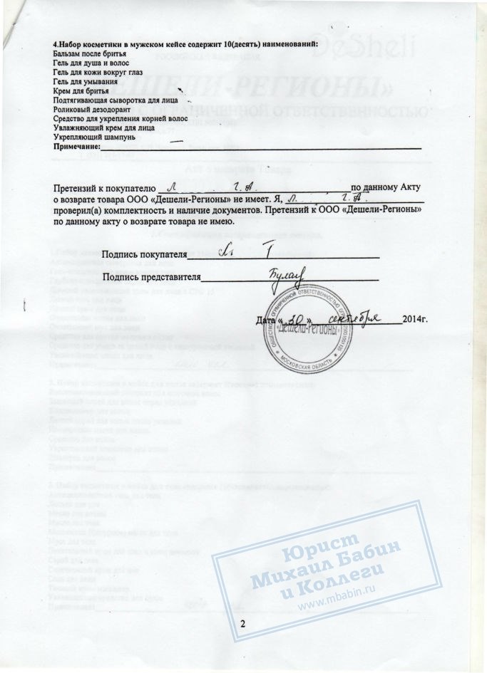 Гражданка Л. была приглашена на бесплатную презентацию косметики «Desheli», где ею в тот же день были приобретены в кредит 2 комплекта косметики. С учетом процентов долг клиентки составил 72.640 руб. К нам Л. обратилась с просьбой помочь расторгнуть кредитный договор и вернуть ненужную ей и неиспользуемую ею косметику.